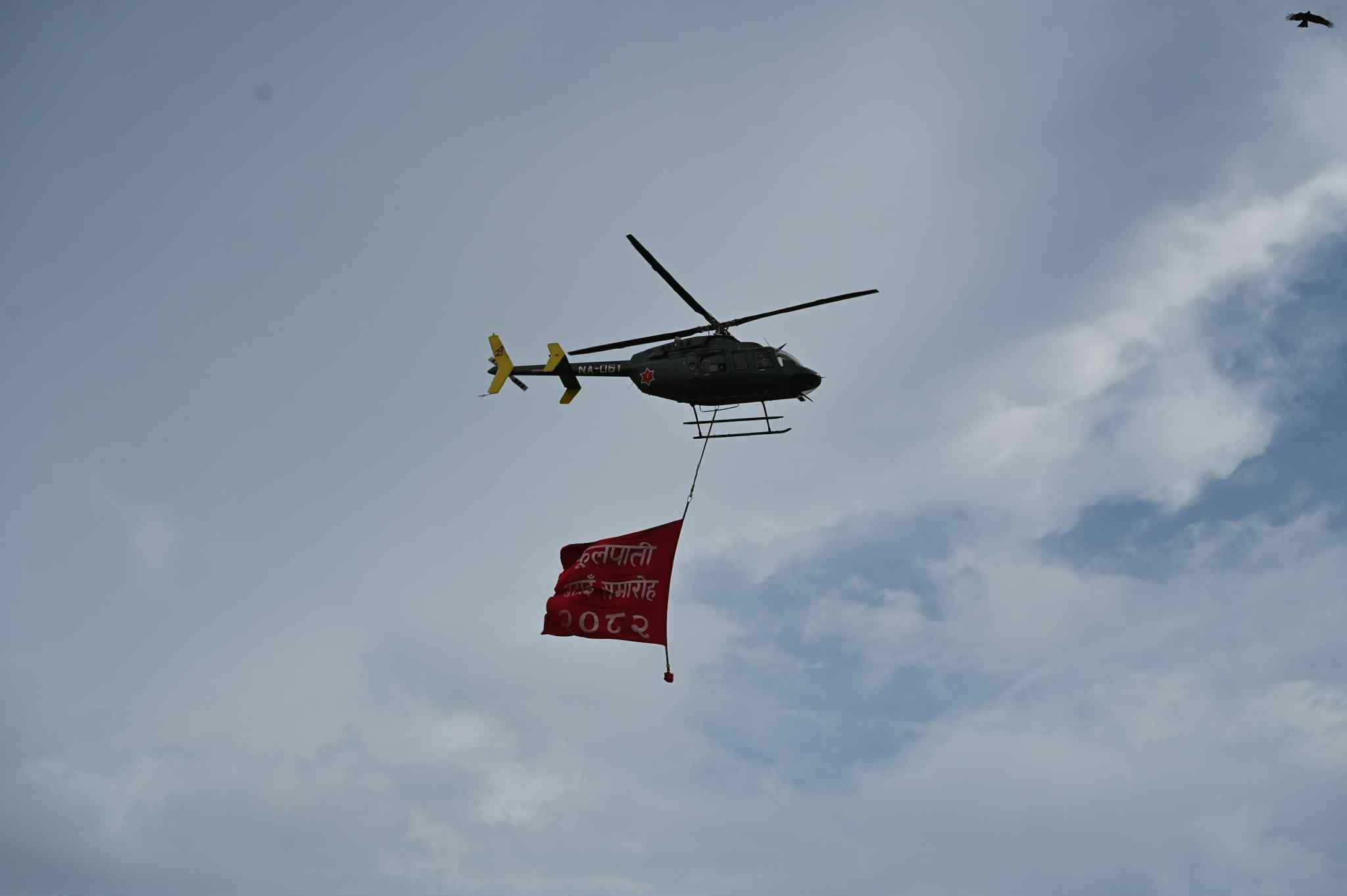 On the occasion, the NA helicopter and drones showered the flowers, and bands played Malshree music and Durga hymns. Various companies of the NA performed drills and march pasts.